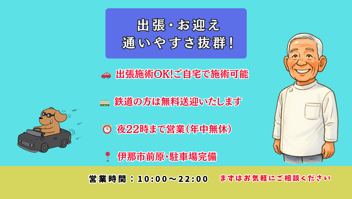 *出張施術も可能です。お気軽にお問い合わせ下さい。